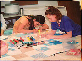 During a pajama-and-pizza party for the younger girls, we chose a quilt top that had many white squares on it. The girls drew pictures reflective of their community or wrote words of encouragement, like “Hope” and “Love” on half the white squares. The older girls wrote Bible verses on the other half. We worked quickly to tie and bind the quilt so we could send it to Terry along with a picture of our girls. Her friend promised to do her best to keep track of it.