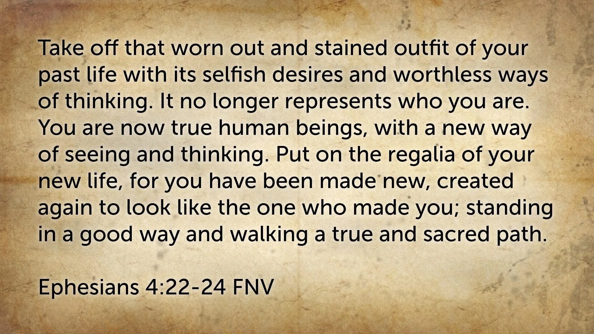 Because of Jesus, our thinking changed. The thoughts and attitudes of the mind that seep into the heart have been made new. Because of Jesus, our actions changed. Our “new outfit” was “created” to imitate the holy God who is right and just in all his works. All of the old me is in the past. All of the new me lives with the full potential to honor God in everything I do.