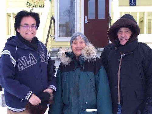 Later they accompanied Rev. Dave & Rosemary Sternbeck to Beaver where Paul Williams, Jr. greeted them with sno-go’s and toboggans to take the boxes of food and presents to the church. Despite the -25 degree temperature, the congregation warmly welcomed them, having started the fire in the wood stove the night before to heat the log structure church. Dave preached, and Curt played music for the hymns. Curt and Sandra taught the children some new songs while Rosemary, Joseph, and Clara helped set out the lunch they had also brought along.