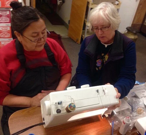 Cynthia and her husband own the village grocery store and hosted the Mellands in their Bed & Breakfast for the week. Sandra had packed sewing projects to teach the women and girls in the community, as well as extra fabric. Many of the girls came after school to sew pillow cases and small quilts they planned to use for an upcoming potlatch.