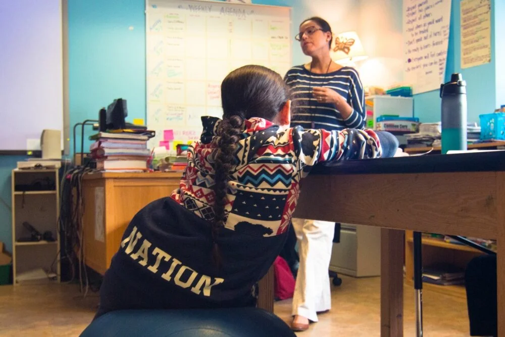 Cecilia Stevens teaching at Saginaw Chippewa Academy. Photo by Rachel Harrison, Central Michigan Life