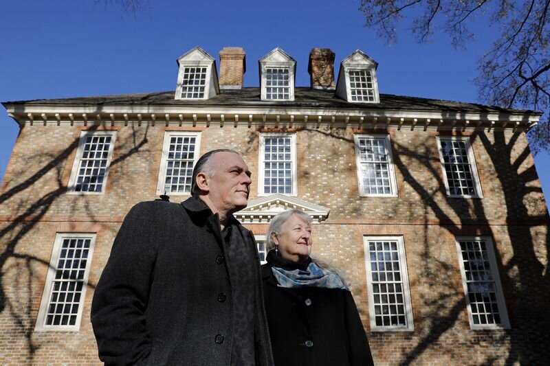 Buck Woodward, left, American University professor and graduate Ph.D. Historical Anthropology from College of William & Mary and Danielle Moretti-Langholtz, research assistant professor of anthropology and Director of the American Indian Resource Center, stand in front of the Brafferton Building on the campus of William & Mary Friday December 20, 2019. Woodward and Moretti-Langholtz co-wrote the book "Building the Brafferton: The Founding, Funding, and Legacy of America’s Indian School" based on their research. (Jonathon Gruenke / Daily Press)