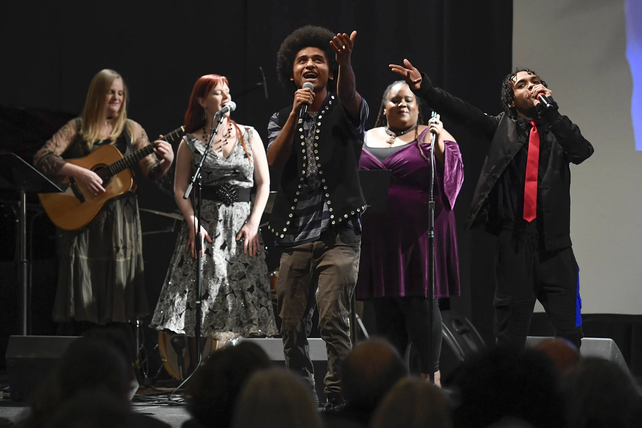 Laura Zahasky, left, Marian Call, Arias Hoyle, Jocelyn Miles and Chris Talley perform at the 2019 Governor’s Arts and Humanities Awards at the Juneau Arts & Culture Center on Thursday, Feb. 7, 2019. (Michael Penn | Juneau Empire)