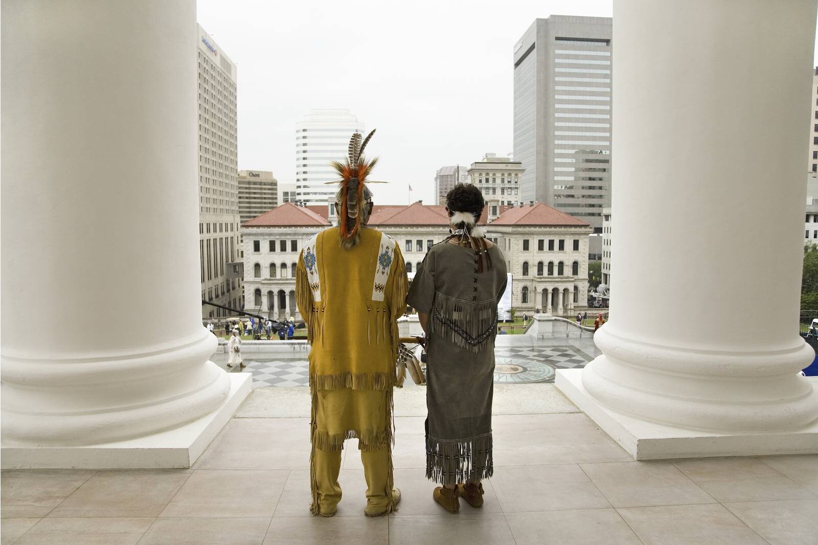 Two Powhatan Tribal members looking over Richmond, Va., from the State Capitol during ceremonies for the 400th Anniversary of the Jamestown Settlement on May 3, 2007. Joseph Sohm—UIG via Getty Images