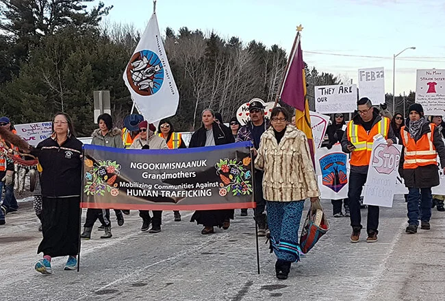 Ngookimisnaanuk Grandmothers Council members Alison Recollet (L) and Marly Day-Bateman lead peaceful march along Hwy 17B – Garden River Ontario – Human Trafficking Awareness Day Feb.22nd, 2018.
