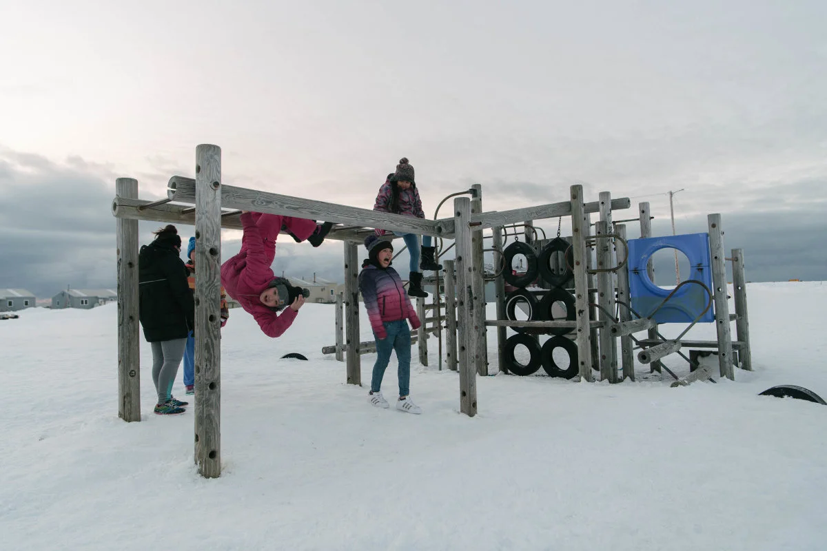 Kids play on a snowy playground in the light of Arctic spring. With each new generation, the traumas experienced by previous generations grow more distant, though the community's youth will undoubtedly face new challenges as they come of age. (Photo: Kiliii Yüyan)
