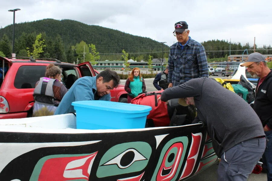 Before they departed last week, a few local paddlers gathered at Auke Bay for last minute preparations. They piled bags of supplies into a long, white canoe covered in formline design with an eagle painted on the bow.