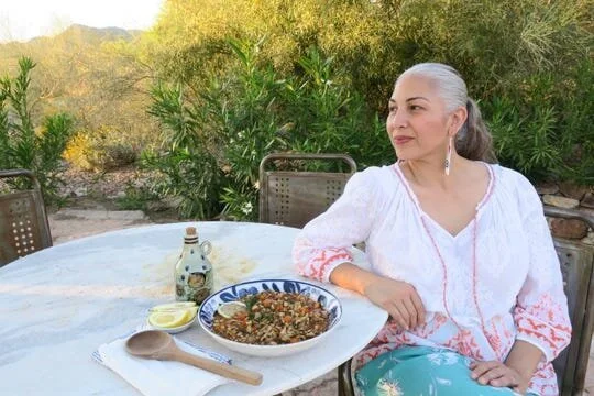 Phoenix healer Felicia Cocotzin Ruiz sits on her back patio with a bowl of black eyed peas cooked with onion, carrots and herbs and featuring fresh lemon juice. (Photo: Courtesy of Felicia Cocotzin Ruiz)