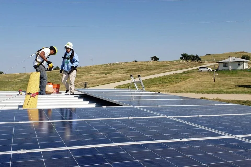 Tribal members install solar panels on the Okreek community building on the Rosebud Indian Reservation. GRID ALTERNATIVES