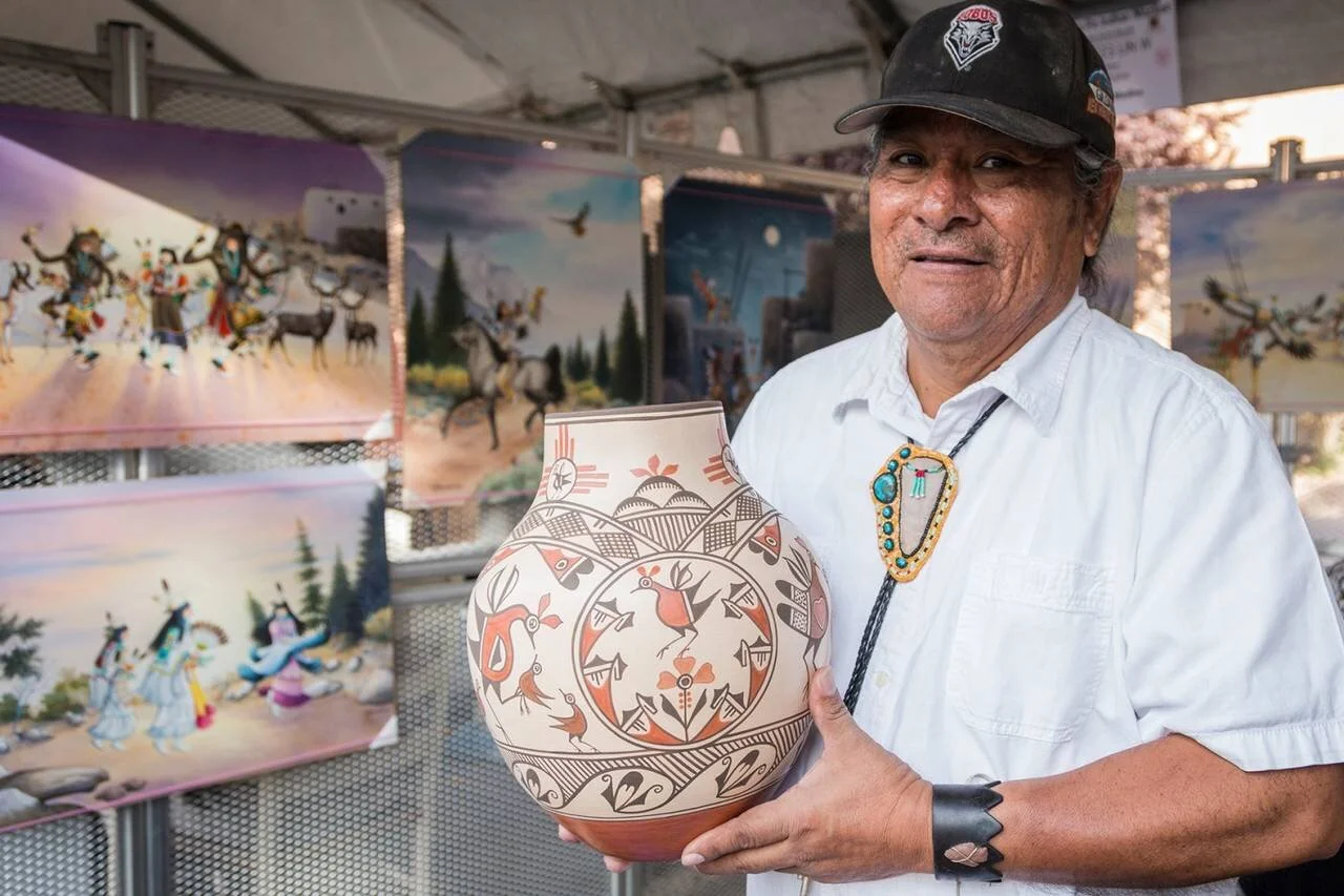Marcellus Medina of the Zia Pueblo in New Mexico sells pottery and 2-D paintings at the Santa Fe Indian Market. PHOTO: GABRIELLA MARKS COURTESY OF SWAIA/SANTA FE INDIAN MARKET